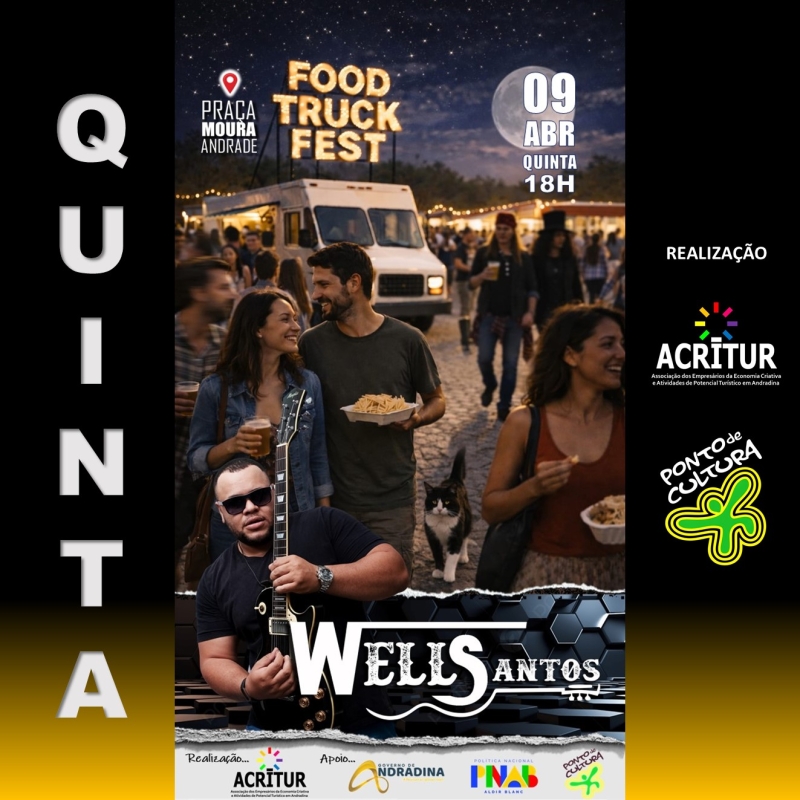 Nesta quinta-feira (9) o Food Truck Fest traz como atração o Músico Well Santos. O evento, que acontece sempre às quintas-feiras na praça Moura Andrade e já se consolidou como uma opção de lazer e convivência para a população, combinando apresentações artísticas com a diversidade de sabores oferecidos pelos food trucks.