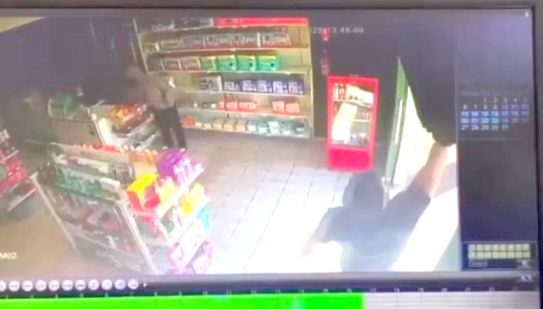 Imagens da câmera de segurança mostram o momento em que o comerciante sai discretamente do balcão, abaixa e tranca a porta pelo lado de fora. O suspeito tenta abrir a porta e chega a dar uma facada na estrutura, mas não consegue escapar.