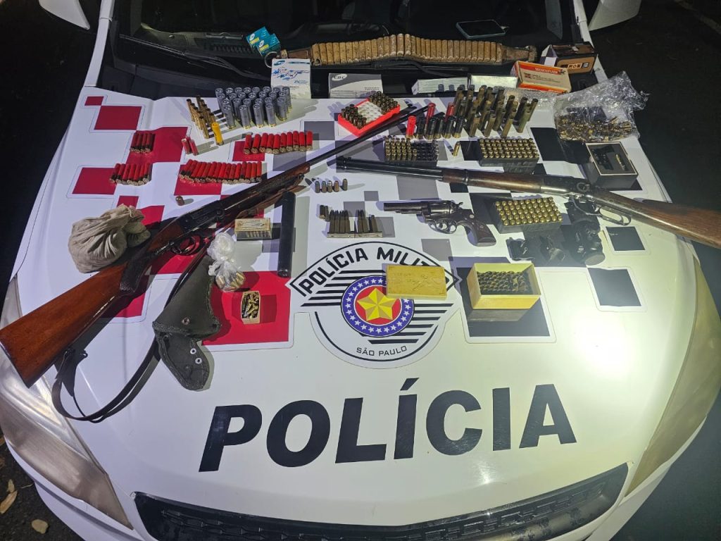 A equipe policial se dirigiu à residência indicada pela vítima, onde o autor foi localizado. Após admitir a agressão e confirmar a posse de armas, ele indicou o local onde o armamento estava guardado. No quarto e em armários da casa, foram apreendidas três armas de fogo — um revólver calibre .357, uma espingarda calibre .38 e uma carabina calibre .36 — além de grande quantidade de munições de diversos calibres, acessórios como silenciador e mira óptica, além de materiais para recarga.