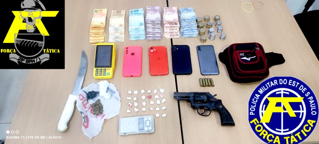 Diante do material ilícito localizado, os dois foram presos em flagrante e encaminhados à CPJ – Central de Polícia Judiciária, onde foram indiciados e permaneceram à disposição da Justiça, aguardando audiência de custódia. O revólver, as drogas, dinheiro e telefones celulares foram apreendidos.