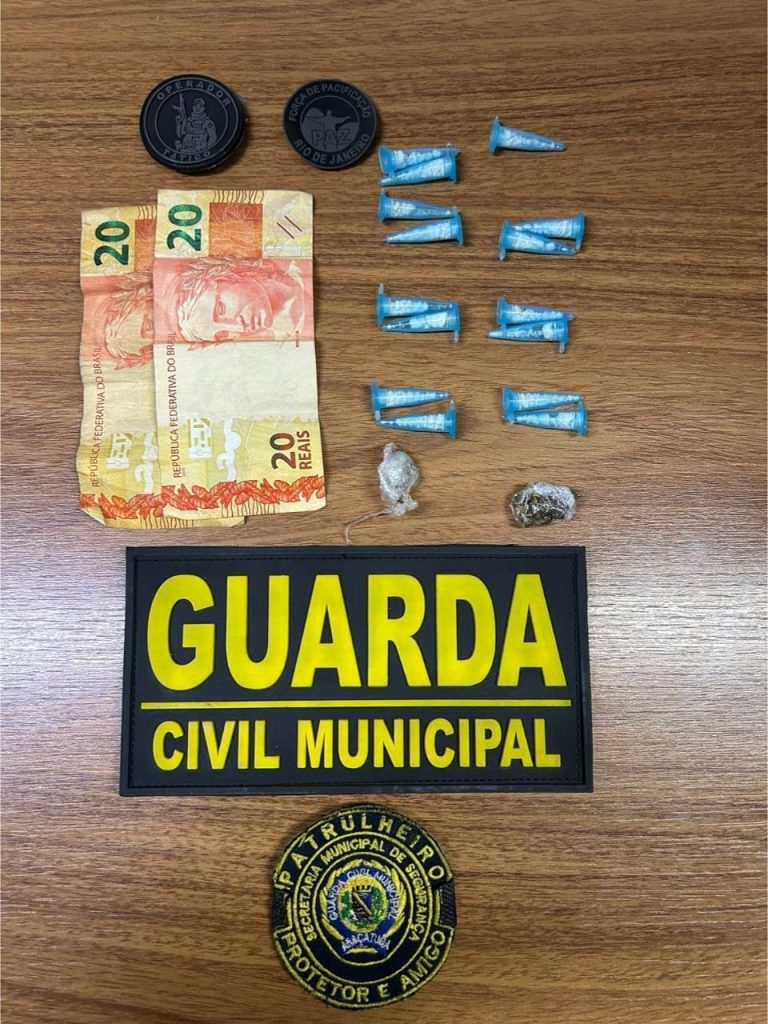 Durante a fuga, ele dispensou uma sacola branca que continha diversos microtubos com substância análoga à cocaína e dois invólucros com substância similar à maconha. Na abordagem, foram localizados ainda R$ 40 em dinheiro trocado e um aparelho celular de uso pessoal.