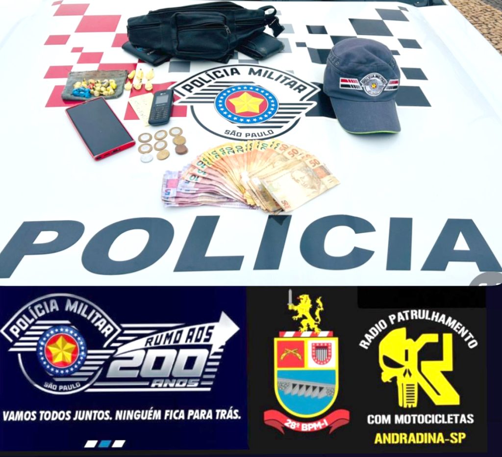 Durante patrulhamento, policiais militares observaram que o condutor de uma motocicleta demonstrou nervosismo ao notar a viatura, o que motivou a abordagem. Com ele foram encontrados celulares, dinheiro em espécie e dezenas de porções de drogas, entre cocaína e crack, além de uma lista com anotações sobre vendas.
