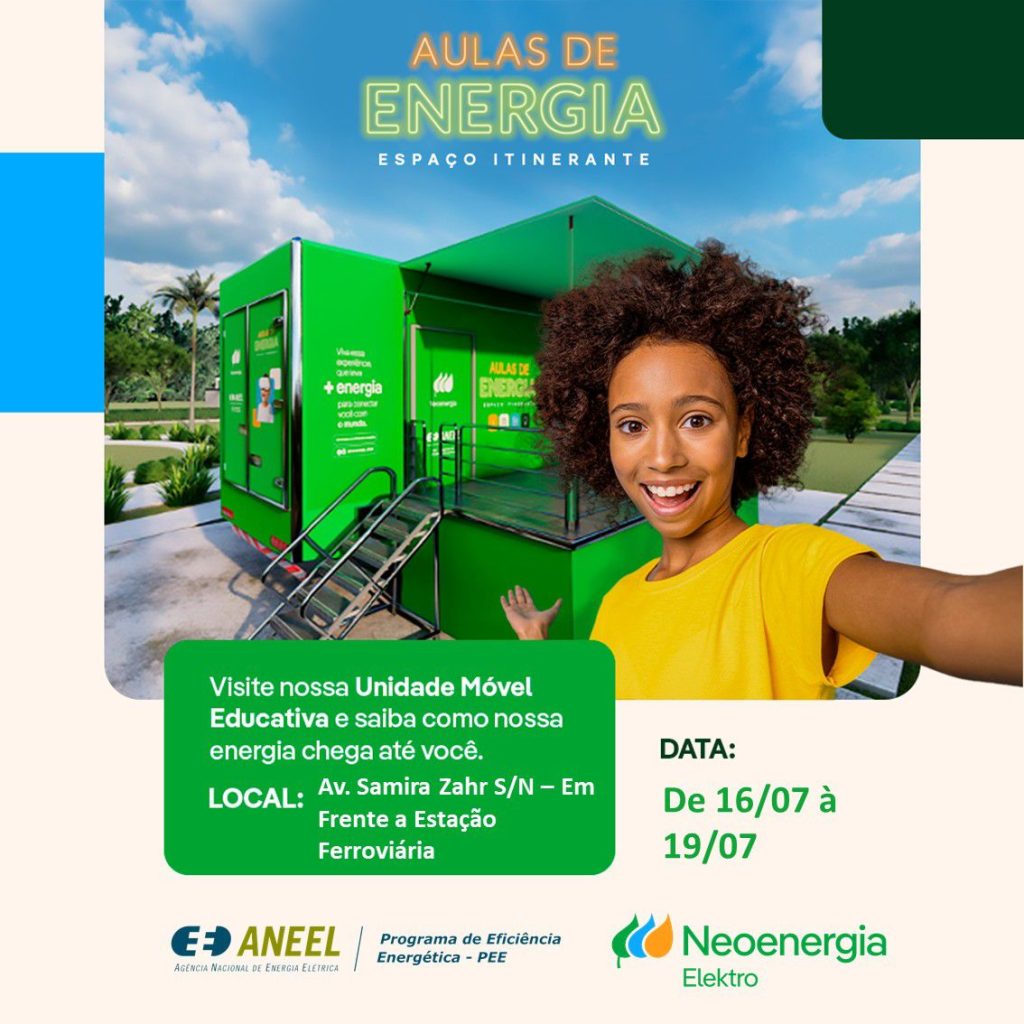 O projeto itinerante “Aulas de Energia” foi criado pela Neoenergia Elektro com unidades móveis educativas que percorrem toda a área de cobertura da concessionária para ensinar sobre energia elétrica, eficiência energética e sustentabilidade.