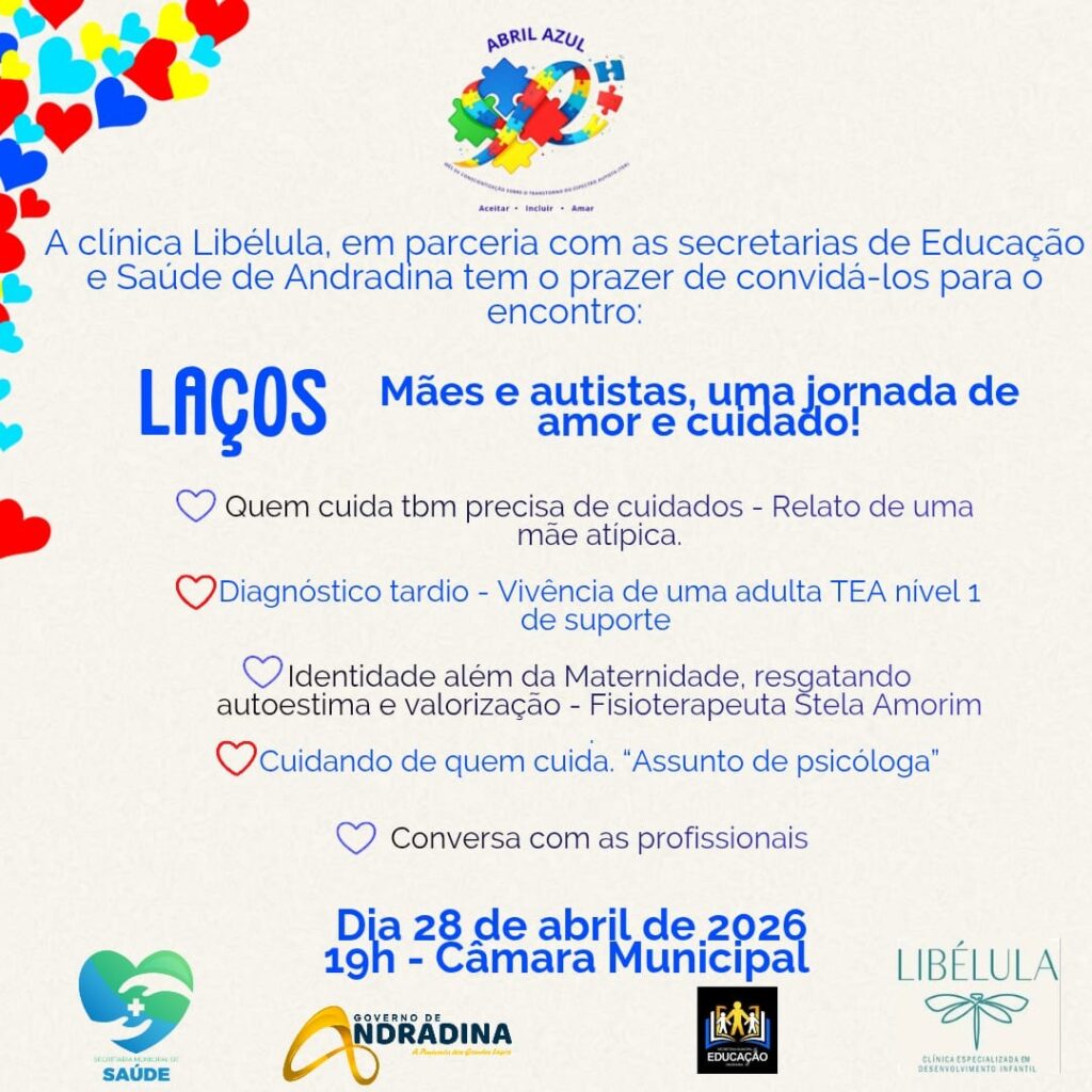 A cidade de Andradina recebe, no próximo dia 28 de abril de 2026, o encontro “Laços – Mães e autistas, uma jornada de amor e cuidado”, voltado à conscientização e ao acolhimento de famílias ligadas ao Transtorno do Espectro Autista (TEA). A iniciativa integra as ações do Abril Azul e será realizada às 19h, na Câmara Municipal de Andradina.