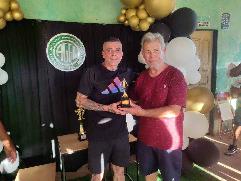 Foto 3: Rodrigo (esq.), do Mais Tintas, recebe troféu de artilheiro da competição, com 7 gols