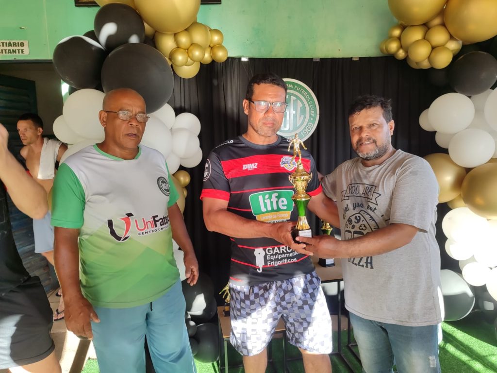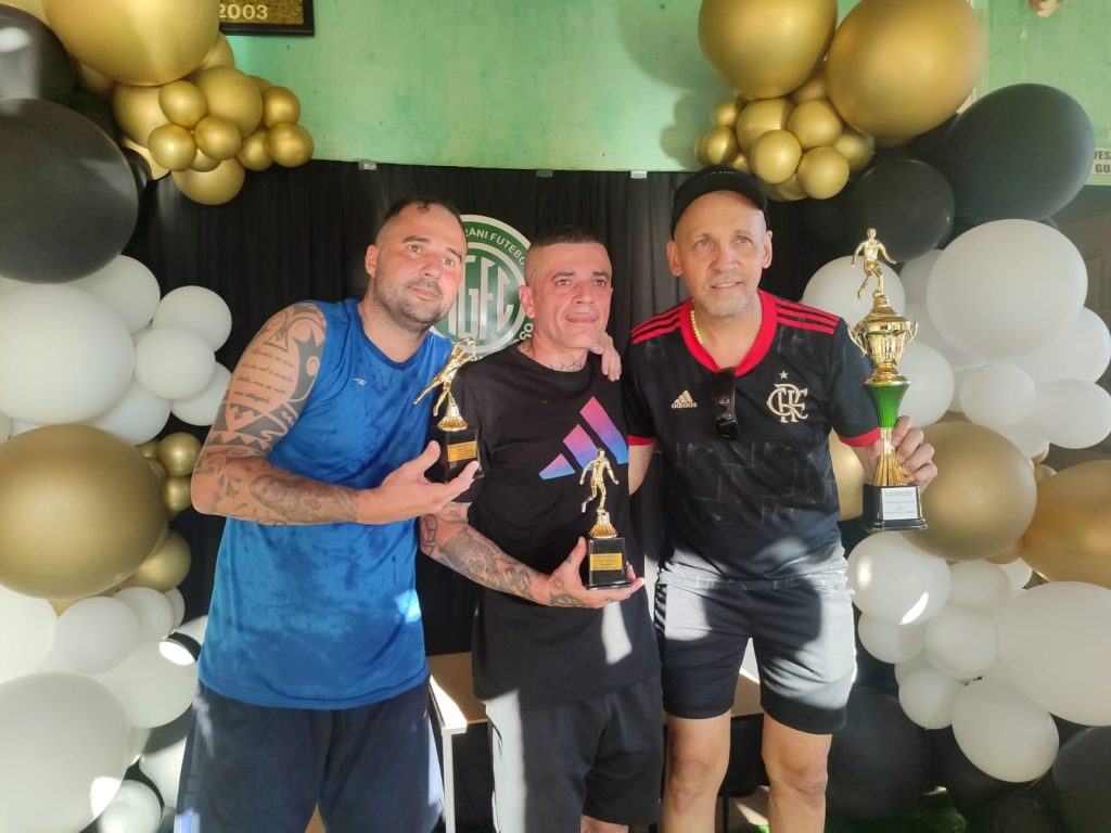 Foto 6: Representante da equipe Amigos da Bola recebe das mãos de Moises (esq.), e Ivan, troféu pelo 3º lugar