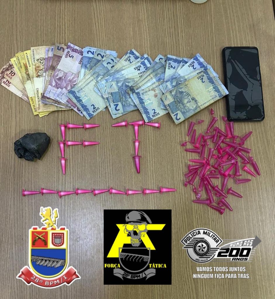No local, uma conveniência, os policiais, após vistoria, encontraram 22 pinos com cocaína, 46 pinos vazios, uma pedra da mesma substância, R$ 263,00 em dinheiro e um celular.