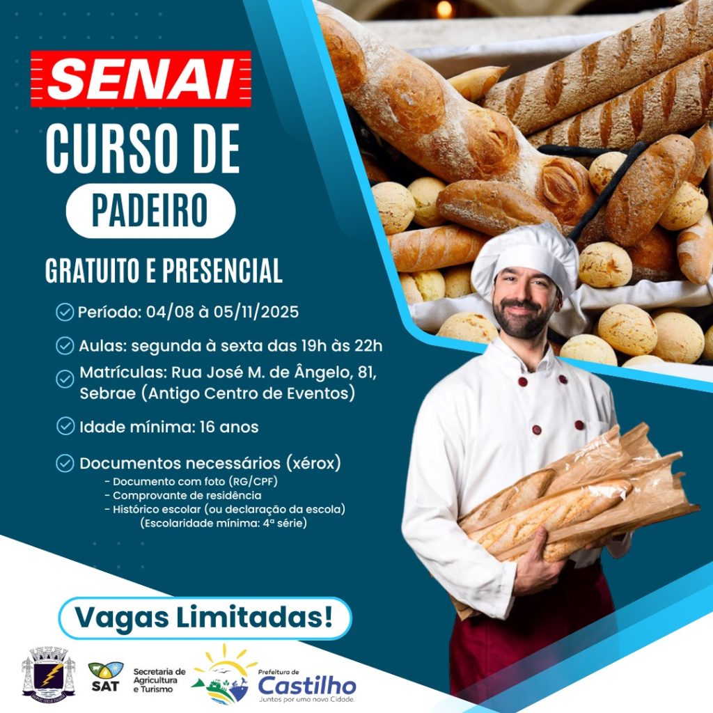 CASTILHO – A Prefeitura de Castilho, em parceria com o SENAI, está oferecendo um curso gratuito de padeiro para a comunidade. As inscrições são gratuitas e devem ser feitas presencialmente no “Sebrae Aqui Castilho”, que funciona dentro do prédio da Secretaria Municipal de Desenvolvimento Econômico e Trabalho (Antigo Centro Cultural de Eventos).