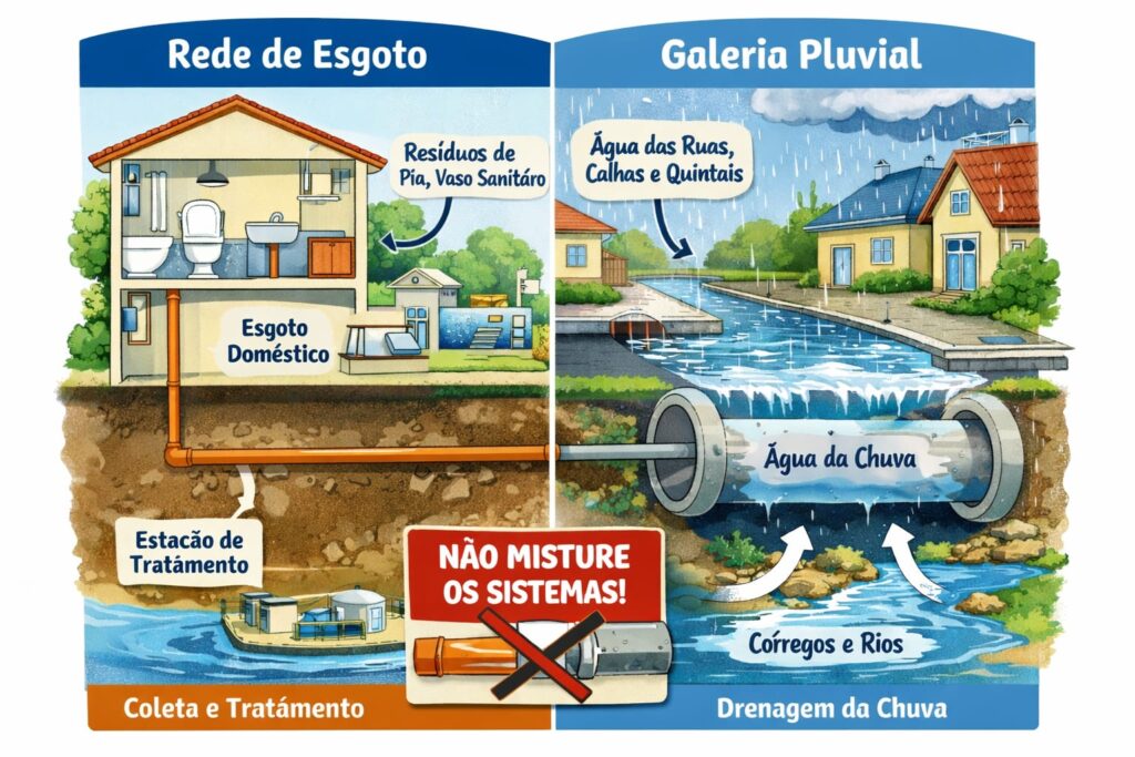 Importante – a separação entre esses dois sistemas é indispensável para preservar a eficiência das redes, evitar sobrecargas e contribuir para a saúde pública, a segurança da população e a prevenção de alagamentos.