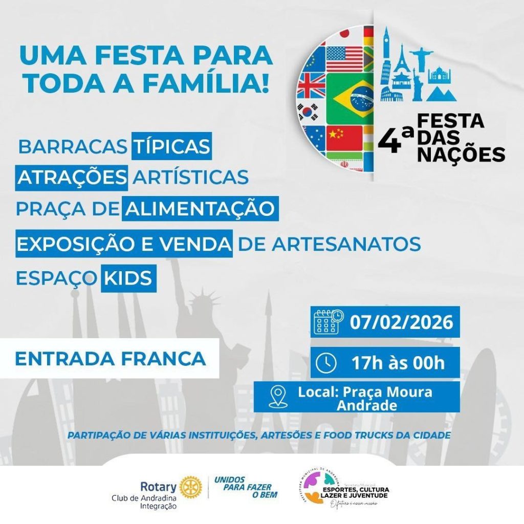 O Rotary Club de Andradina Integração realiza no dia 7 de fevereiro a 4ª edição da Festa das Nações, um dos eventos mais aguardados do calendário cultural do município. A festa acontece na Praça Moura Andrade, das 16h à meia-noite, com entrada gratuita, e promete reunir gastronomia, cultura e entretenimento para toda a família.