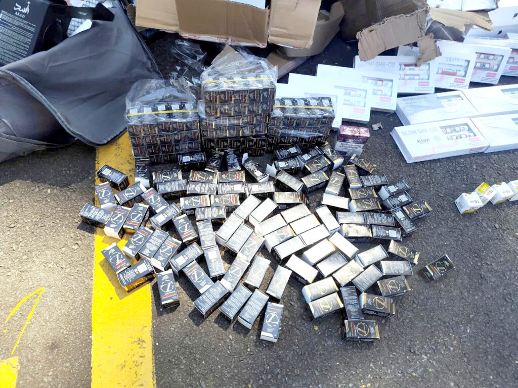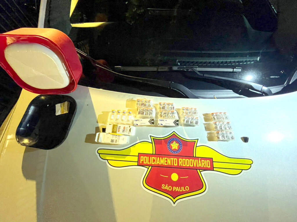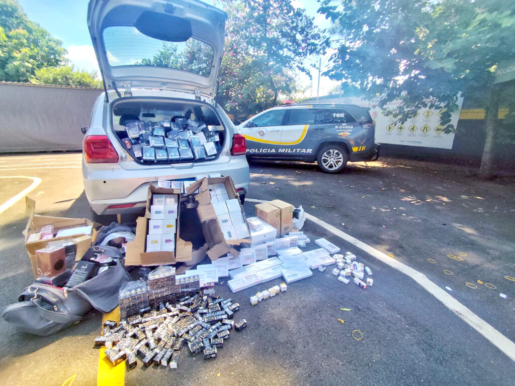 Em vistoria no carro, os policiais encontraram diversos produtos do Paraguai, entre eles, 4 mil cigarros eletrônicos, 3 Mac Book, 2 Iphones 15, 200 frascos de perfumes, 22 garrafas de vinho, além de 162 ampolas de anabolizantes e 165 canetas emagrecedoras.