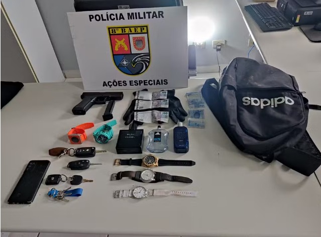 Durante o roubo, os criminosos levaram diversos itens, entre eles perfumes, chaves de veículos, relógios, um aparelho celular e dinheiro em espécie.